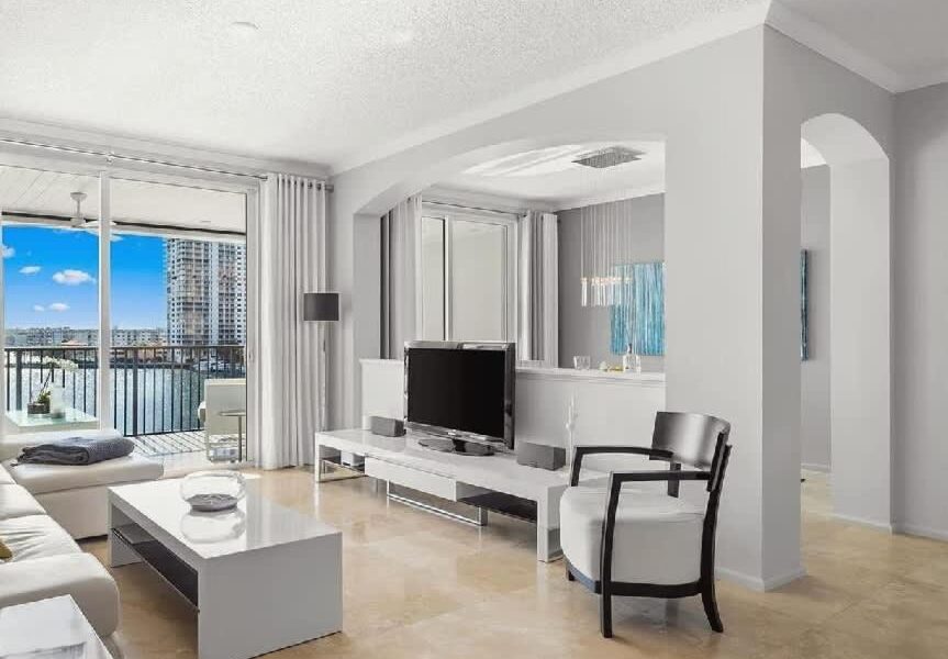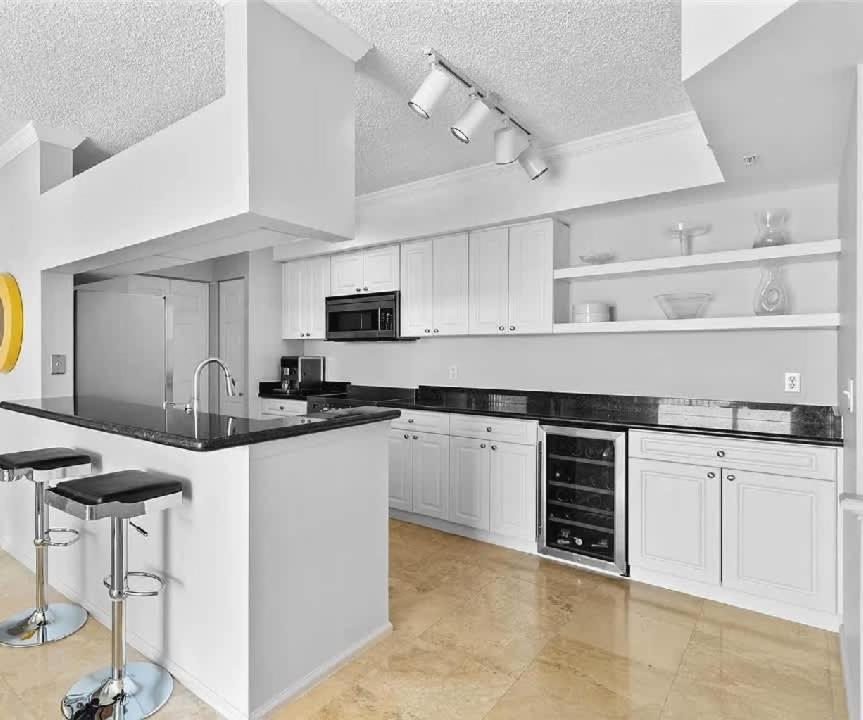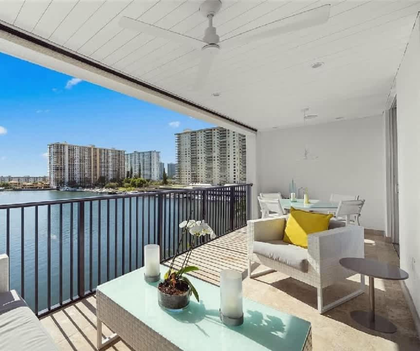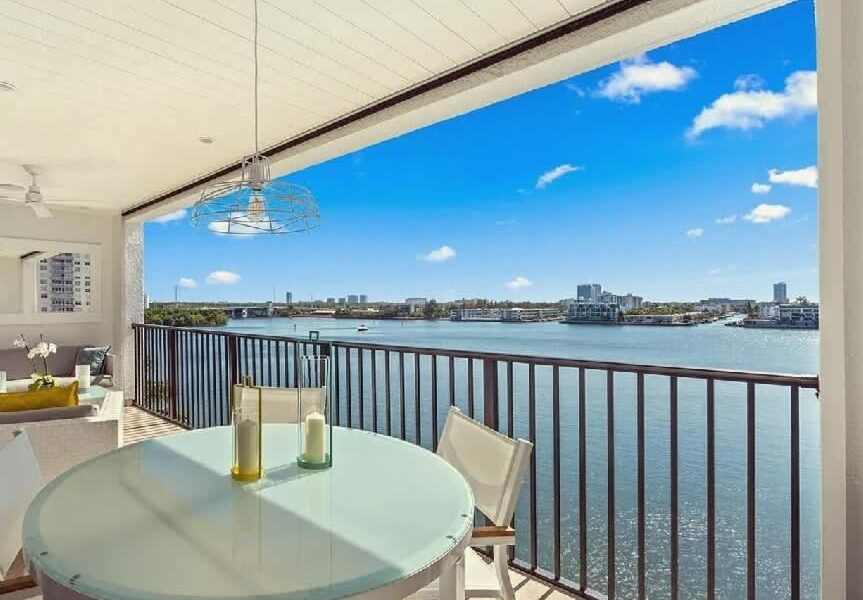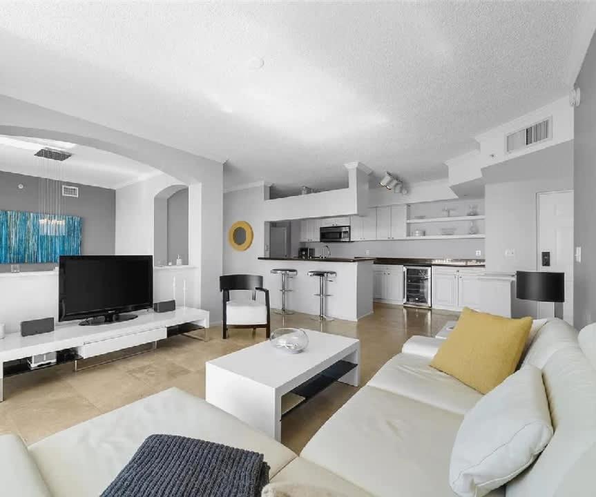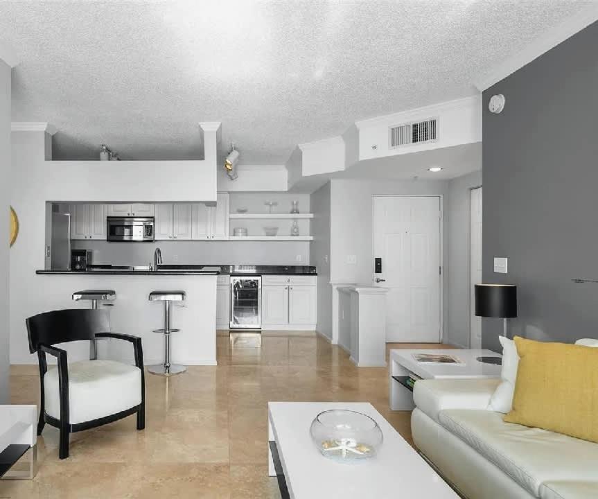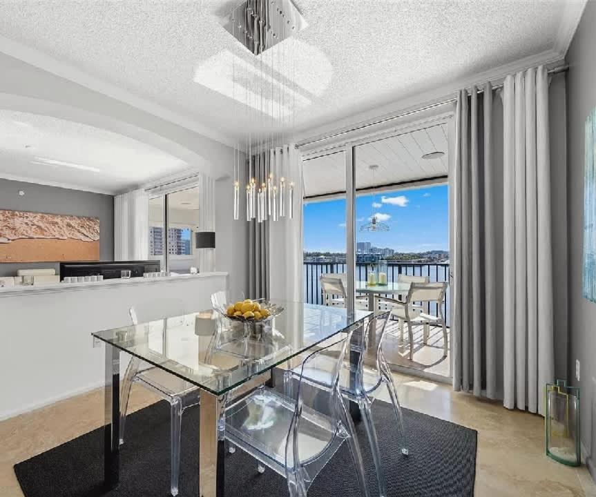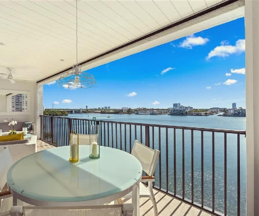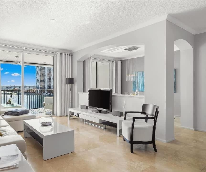 Waterfront apartment offering intracoastal and pool views from every room, with a bright open layout designed for comfortable short-term stays. The interior features tiled living and dining areas, carpeted bedrooms, granite countertops, stainless steel appliances, walk-in closets, and a private balcony overlooking the water. The apartment includes an in-unit washer and dryer and two assigned parking spaces, one covered and one uncovered. Guests have access to a gated building with a heated pool, jacuzzi, fitness center, children’s playroom, and business facilities. Located within a short walk to the beach, as well as nearby restaurants, cafés, shops, and grocery stores, the apartment provides a convenient coastal setting for a Sunny Isles Beach vacation.